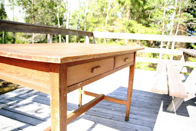 Vi kjøpte et bord på et av de siste loppemarkedene i vår. Det var tiltenkt kjøkkenet, siden det bordet vi har der nå, er litt i minste laget. Det så ganske slitent ut, men hadde blandt annet fine ben som går litt ut nederst og tverrstolpen og skuffene var også en grunn til at vi kastet oss over det. Og vi hadde veldig klare planer for hvordan vi skulle pusse det opp! (Bildene er litt lyse, hadde glemt at ISO-en sto på maks....)